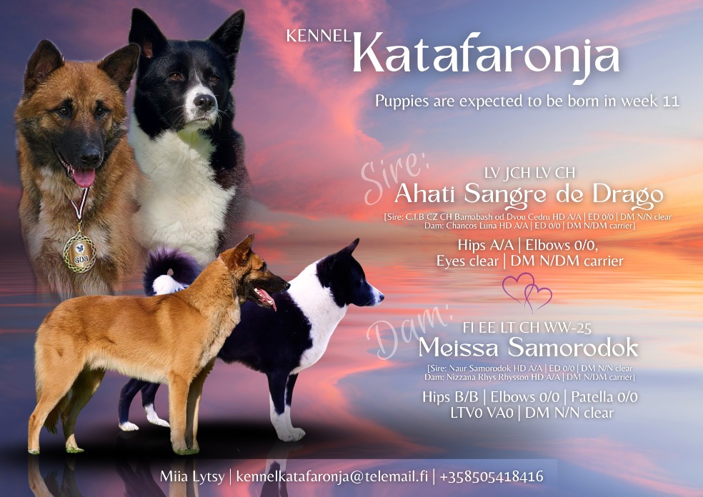 Z chovatelské stanice Katafaronja ve Finsku, kde se věnují chovu kanaánských psů, přišla krásná zpráva – po 16ti letech tam očekávají štěňátka! Březost je potvrzena a Ahati, který žije v Lotyšsku, se tak stane v březnu poprvé tátou. Ahati je prvním psem z našich odchovů, který se aktivně zapojil do chovu (kromě našich psů). Máme proto obrovskou radost! Ještě jednou gratulujeme a přejeme hodně štěstí.